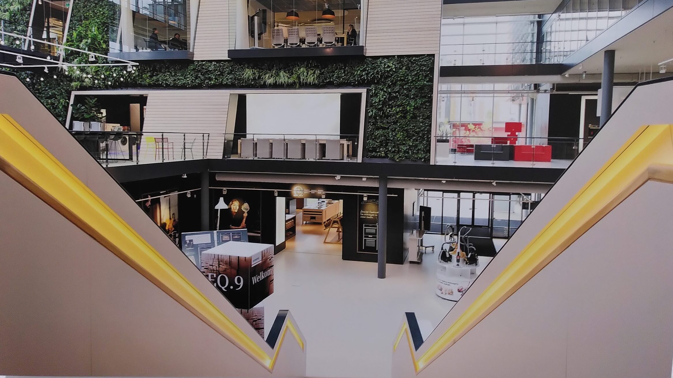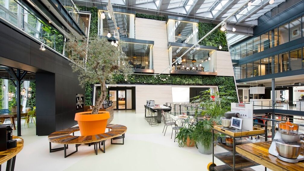 Een licht atrium met vier verdiepingen, groene levende muur en een glazen dak met geïntegreerde zonnepanelen vormt het hart van het gebouw. Deze centrale ruimte verbindt flexibele werkplekken, showrooms, een auditorium en een kookstudio, ingericht voor interactie en inspiratie.